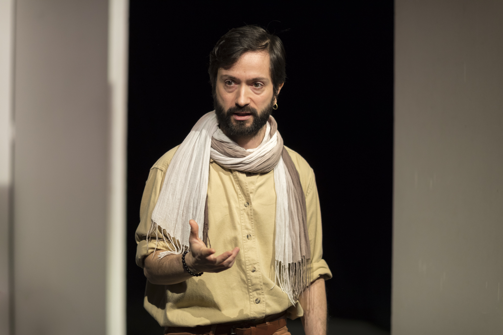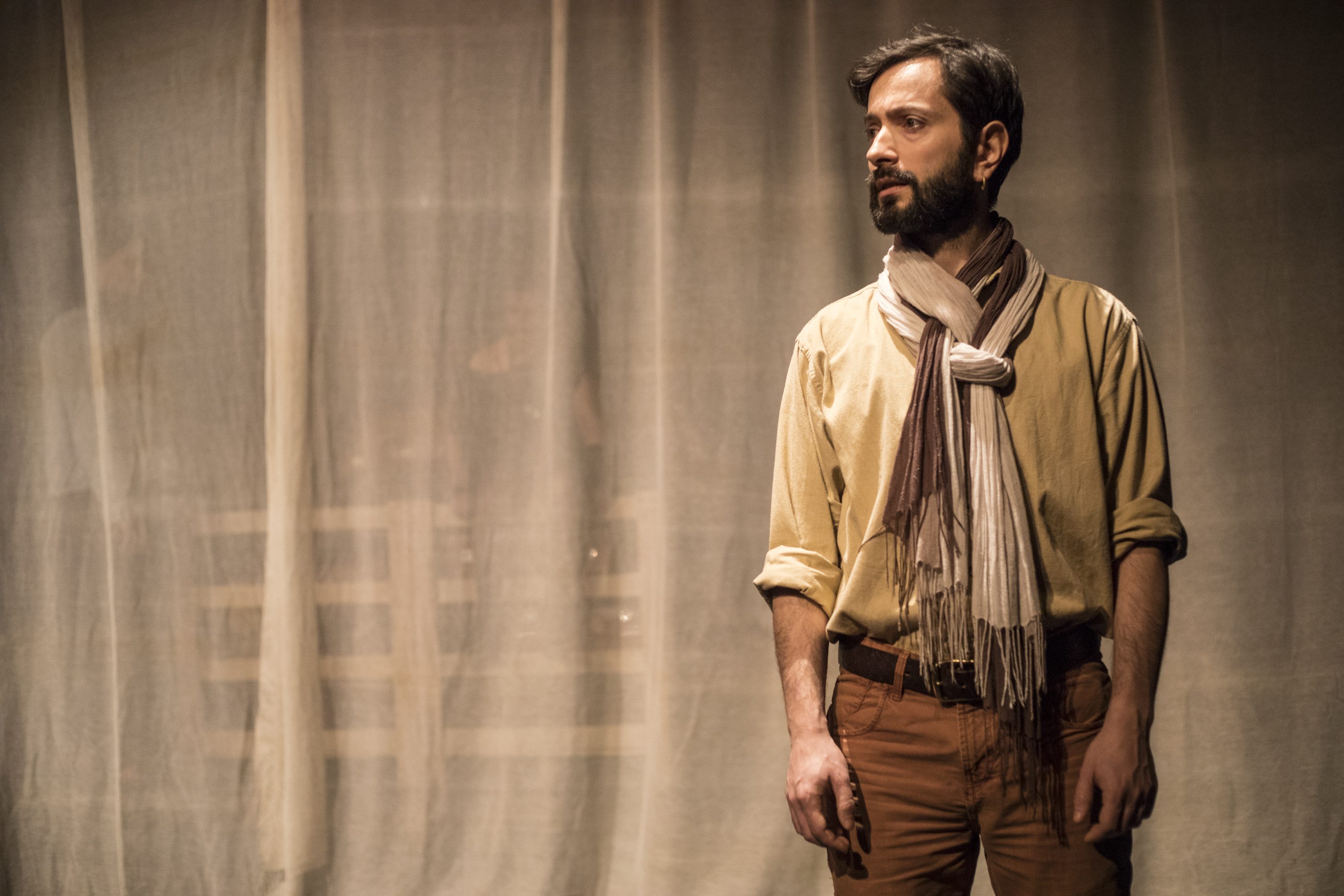 C’est important pour moi de rencontrer une équipe d’acteurs prêts à fusionner et à se diriger vers un objectif commun de création. Au delà du collectif, j’ai choisi de travailler avec un groupe d’acteurs et de musiciens provenant de quatre nationalités différentes. C’est important pour moi de véhiculer un message universel dans Tartuffe, puisque chaque culture peut se sentir concernée par cette histoire. Pour revenir aussi à la dimension première de vivre ensemble, il me semblait essentiel que chacun des membres de l’équipe dans cette version de Tartuffe apporte un peu de sa culture par son rythme, sa langue, son accent, sa musicalité, pour représenter la diversité du monde actuel dans lequel nous vivons. Cette mixité est sublimée par l’apport de la musique qui se joue en direct par un saziste et flûtiste Syrien et un percussionniste italien. La musique est présente pour faire le lien entre les scènes reprenant la tradition des « entre actes » de Molière. Elle est organique contrairement à une bande son enregistrée qui est figée et agit ainsi directement en continuité pour compléter la respiration des acteurs. Cette musique qui a pour inspiration des sonorités traditionnelles, se mélange à la percussion et crée finalement une sonorité universelle. Aussi ce rapport direct à l’univers en lien avec les astres est représenté dès le départ par la danse du « derviche ». Ce personnage tournant sur lui même en accord avec le son, fait appel à tout ce qui nous dépasse en tant qu’être humain.